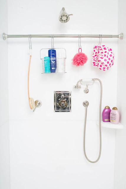 Dica super legal para manter o box organizado com muito espaço para armazenamento: varão para cortina regulável e ganchos. Muito interessante para quem aluga um imóvel, não quer fazer furos na parede ou só quer aumentar a utilidade do espaço. Muito bom!